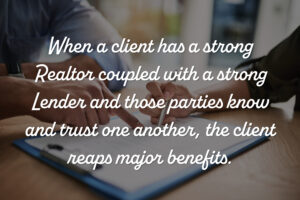I am often collaborating with my Realtor partners to strategize offers, seller contributions, and funds needed for repairs post-closing. This is essential to clients – when a client has a strong Realtor coupled with a strong Lender and those parties know and trust one another, the client reaps major benefits. Homebuyers that use a large shop-online-lender will get a loan. Our clients get the best deal.